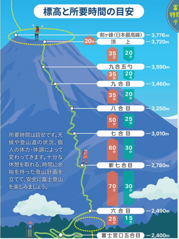 富士宮ルートの標高と所要時間の目安は以下の通り👇